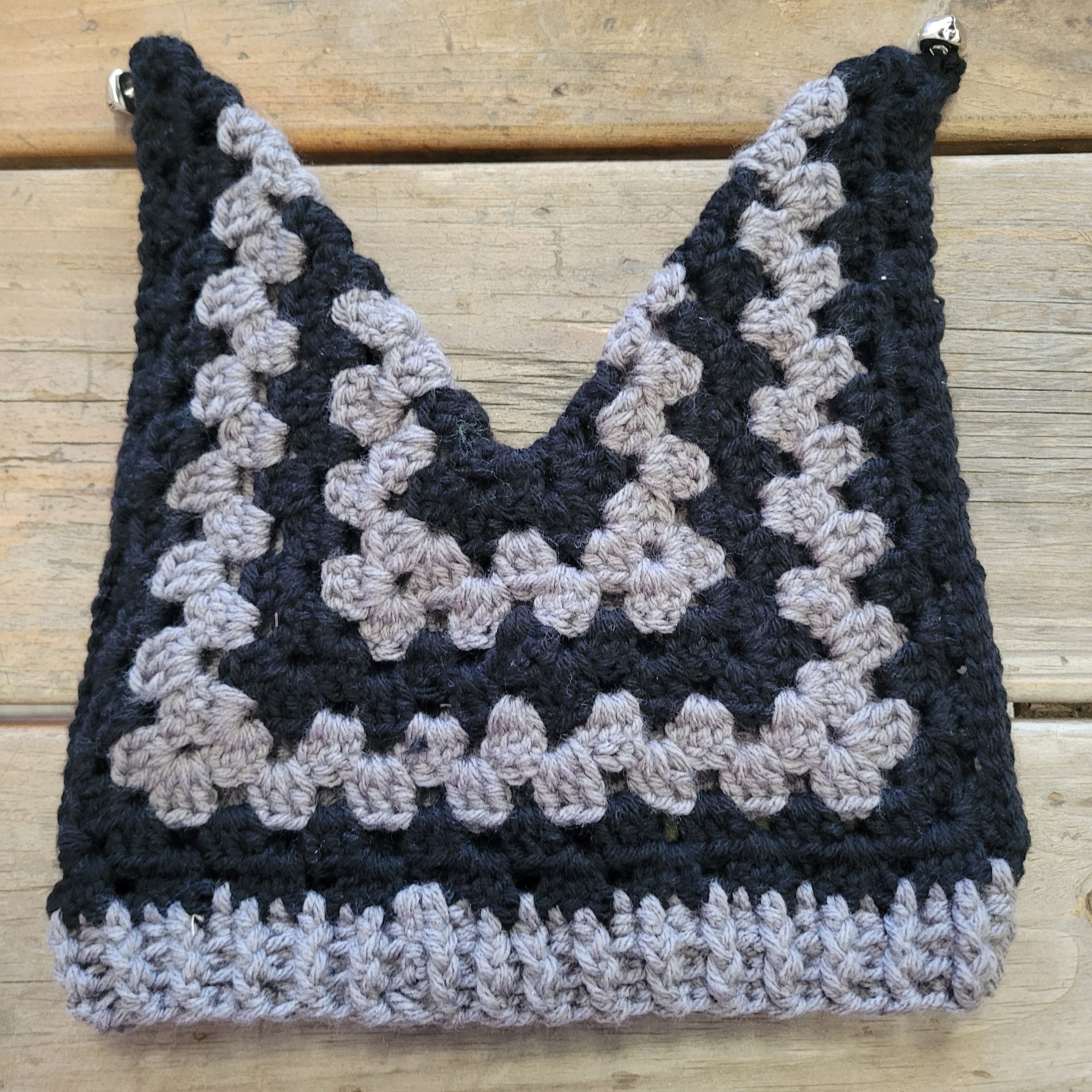 Crocheted jester hat with alternating black and gray yarn. Has a small bell on each point for a jingly sound while you walk.
